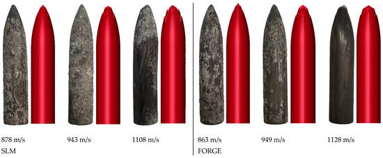 Table 14 shows the wear results of the projectile length. The error between the test and the numerical simulation was no greater than 2%, which further verified the reliability of the numerical model. With an increase in target velocity, the wear of the projectile length became more serious. The SLM-shaped projectiles were more wear-resistant than the forged projectiles, indicating that the SLM forming process had a better anti-wear effect on projectiles.