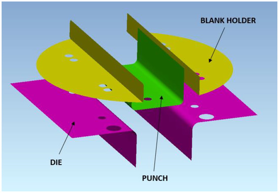 Bending and springback simulation was performed using PAM-STAMP 2G software (ESI Group, Rengis, France). Mentioned software is widely used for sheet-metal forming simulations and uses an explicit solver. The CAD model of the bending tool (Figure 5) was imported into the software, and blank dimensions and its position were defined. The blank was mashed with shell elements, the initial size of the element was 2.7 mm, and after refinement, the size of the element was 1.35 mm. The material properties of dual-phase steel were defined using three different yield criteria (Yoshida, Hill48, and Barlat2000) and three different hardening laws (Yoshida-Uemori, Krupkowski, and Hollomon). The blank holding forces values in the simulation were the same as in the experiment, these forces were represented by linear function based on the experimental measuring of spring forces. To represent bending without lubrication, the coefficient of friction value f was set to 0.27. Bending simulations with a coefficient of friction value of 0.10 were conducted to represent bending using PE foil. The simulations were designed to analyze the changes in predicted springback caused using different material models, different values of blank holding forces, and friction. Numerical springback results were compared with experimental ones.