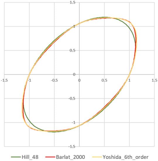 Three yield criteria were used in the springback prediction research. The Yoshida [39], Hill48 [40], and Barlat2000 [41] criteria were utilized in the numerical simulation to evaluate the springback prediction accuracy (Figure 6). The parameters to define the above-mentioned yield criteria are specified in Table 3.