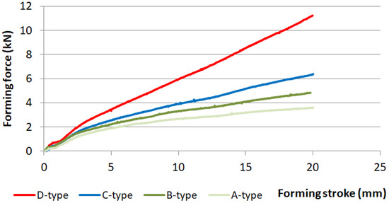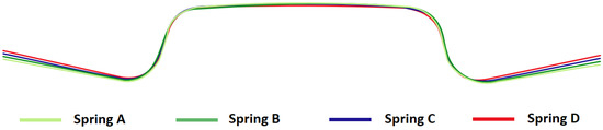 The effect of blank holding force and friction on the springback of the hat-shaped part was investigated. Four types of springs were used in the experiment. The impact of friction was studied using samples without lubrication and samples wrapped in PE foil. The shape comparison of samples produced while using four different types of springs is shown in Figure 7. In Figure 8, the shape comparison of two samples produced using PE foil and no lubrication, while using springs of type D, is presented. The comparison of forces during forming with different types of springs and no lubrication is shown in Figure 9. The values of angle α for samples made using different types of springs without lubrication are presented in Table 6, and angle α values for parts produced with lubrication are shown in Table 7.