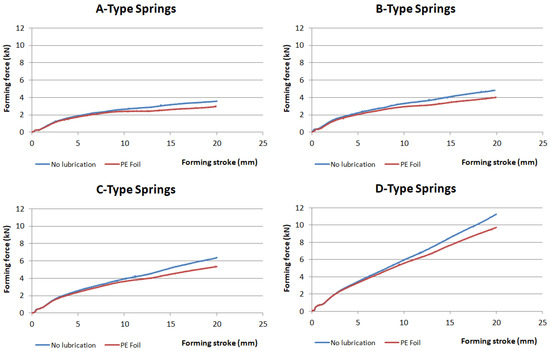 Figure 10 shows a comparison of forming forces for each type of spring with and without lubrication.