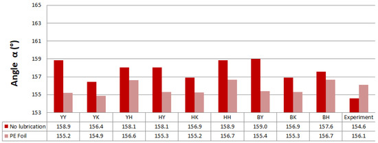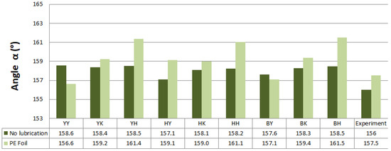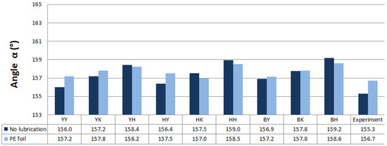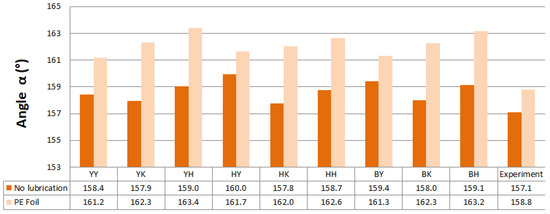 Predicted values of angle α after springback calculation with the use of different combinations of yield criteria and hardening laws for the spring types A and B with and without lubrication are shown in Figure 11 and Figure 12. Predicted values of angle α when spring types C and D were used with and without lubrication are shown in Figure 13 and Figure 14.