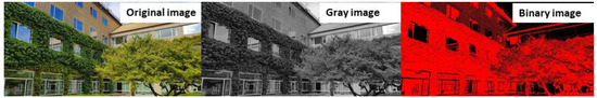 One method of image processing is converting an original color image into a grey one (0–255 grayscale [39]; Figure 1, middle), followed by analysis. This simple and quick transformation can extract information that can be used in the subsequent steps of the algorithm. However, it simultaneously causes a loss of information in the individual components. Alternatively, binarization of the color image can be performed for one individual component of the image, which permits obtaining the binary image directly from the color image (Figure 1, right).