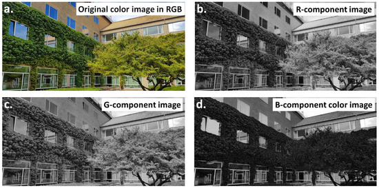 If object detection on a grey image is not recommended or if a determination of the binarization thresholds for a color image is problematic, the RGB image can be split into components. This transformation produces three multi-shade images, representing the red (R), green (G), and blue (B) components, respectively (Figure 3a–d). Then, an individual image can be subjected to further transformations, such as object detection.