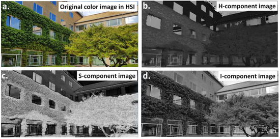 In some cases, the RGB model does not permit the detection of objects effectively. This results from insufficient color differences between the objects and the background, in terms of the values of the individual color components. Therefore, it may be useful to perform a color transformation from the RGB model to the HSI model. The result of this transformation is an image stored in the HSI model, as shown in Figure 4a–d. In this method, the color image is split into its components and the differences between the images are analyzed. Even if there is no significant difference in the share of the individual RGB components, the differences will be visible in the share of the components of saturation, intensity, and brightness of colors. The most suitable component can be selected for further transformation and detection.