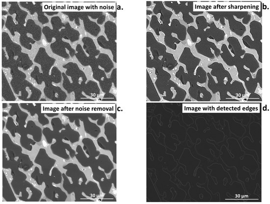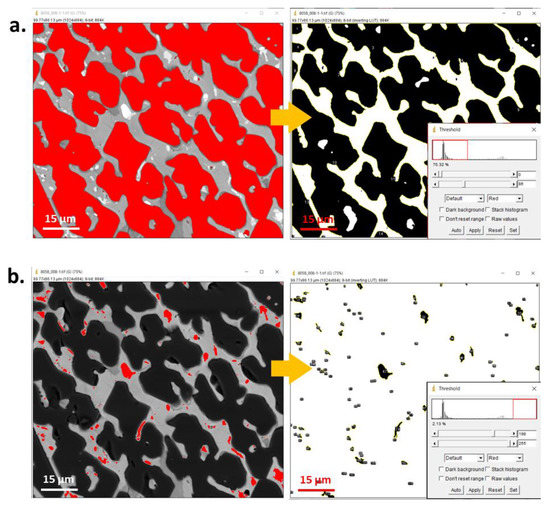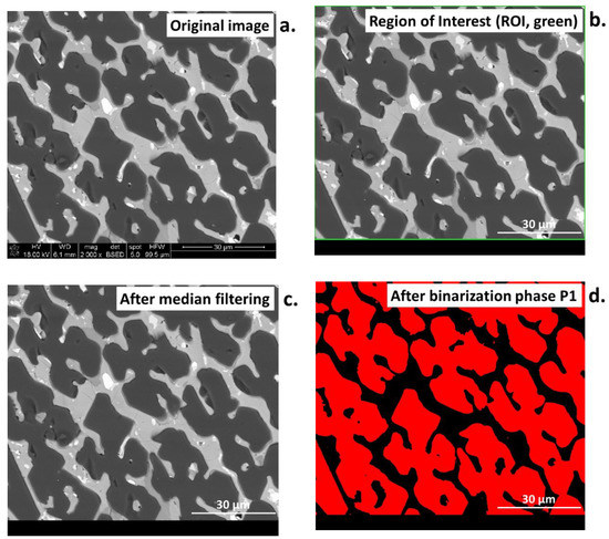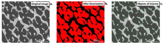 In materials engineering, microstructure mostly determines materials’ properties. Modifications on the microstructural scale enable tailoring of the desired properties of a material. Scanning electron microscopy equipped with energy (SEM/EDS) or electron microprobe analysis with weave dispersive spectroscopy (EPMA/WDS) are common and effective tools that permit the extraction of spectroscopic qualitative information [21]. The obtained microstructural images can be subjected to image analysis to retrieve more data on materials, such as the quantity of the individual phase components. Traditional methods based on stereology rules can be applied, but they are time-consuming and less accurate due to the occurrence of systematic errors. The application of automated, computer-based methods has been recently developed for different kinds of materials. Binarization was used to detect the pores in cement pastes with different W/C ratios and their further geometrical characterization (diameter, roundness) to investigate the formation of capillary pores [4]. Image recognition and analysis were conducted on Al2O3/WS2 coatings on Al alloys to determine the volume share of areas of distinguishing filamentous morphology [5]. Kubinova et al. [22] compared several stereological and digital methods for estimating the surface area and volume of cells on confocal microscopy images and discussed their pros and cons in the context of the isotropy of the studied material.