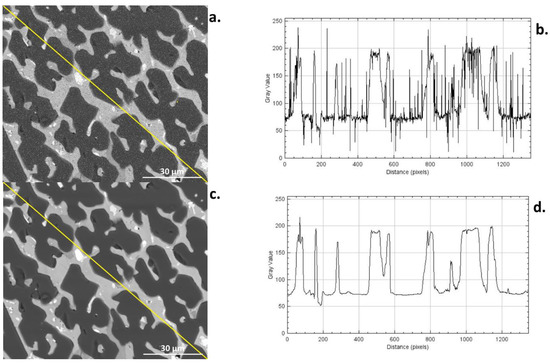 Filters can help significantly in image preparation, e.g., if the image was registered with a signal. This can be evidenced by comparing the profile of the image with noise (Figure 6a,b) to the image after noise reduction (Figure 6c,d) using the median filter [39]. The profile after filtering is significantly smoothed compared to the image with noise. This is an ideal operation for inhomogeneous noise with varying degrees of grey. Sharpening filters should be avoided when performing quantitative image analysis as they can introduce additional noise, despite the improvement in the quality of the image.
