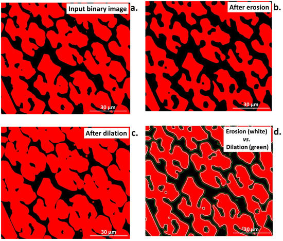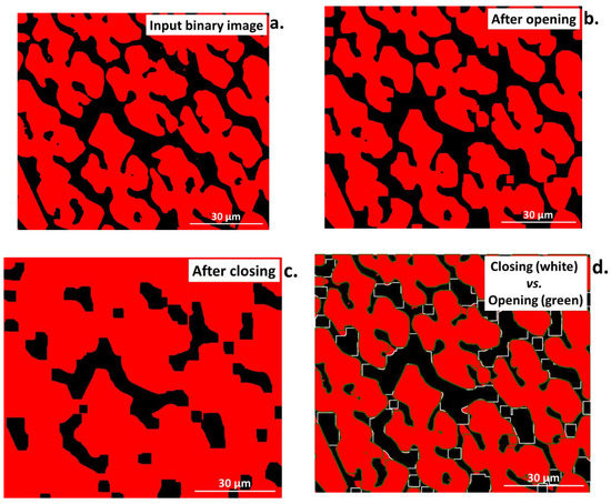 Opening and closing are more complex operations, combining erosion with dilation (Figure 8a–d). In the opening operation, the erosion is followed by dilation. However, it uses the same pattern (structural element) and maintains the same operation size in both steps. First, erosion breaks up the thin lines in the input image that connect objects. Then, dilation permits the approximate recreation of these connections [3,33]. As a result, the separation of elements will be obtained in the output image, as shown in Figure 8b. The characteristic feature of the opening operation is that it removes small elements and details without changing the size of the main part of the image.