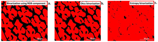 Binarization is one of the most significant operations in image analysis [3,39,41]. It facilitates the analysis and conducting of measurements at the images, especially in terms of percentage quantification of the objects relative to the rest of the image, determination of the object parameters (areas, perimeters, etc.), and displaying them on screen. Numerous binarization methods have been developed so far, e.g., applying an upper threshold, a lower threshold, and two thresholds. Moreover, various automatic binarization methods are used that determine threshold values based on the analysis of selected image features. The Otsu or entropy thresholding method is an example of the automatic threshold algorithm, based on the histogram of grey-level distribution.