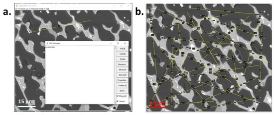 Figure 11. Windows of ImageJ during the linear analysis of the image, (a) using ROI Manager for adding the secants and chords, (b) with all secants and chords.