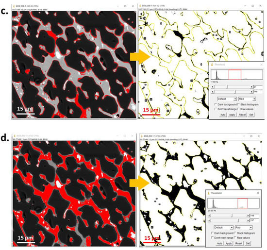 Figure 12. Window of ImageJ during binarization (by manual thresholding) and planimetry analysis of phases (a) P1, (b) P2, (c) P3, (d) P4.