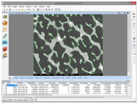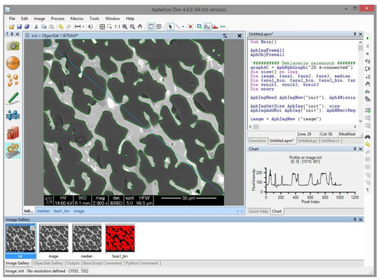 Aphelion software was used for the development of the algorithm for automated image analysis. The user interface of Aphelion during analysis is presented in Figure 13. The software is equipped with the necessary modules to perform individual operations and permits the simultaneous detection and percentage amount measurements of the objects present in the SEM image. In addition, all the data produced during analysis can be saved as a macro command in the Visual Basic language.