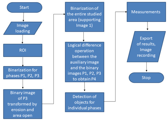 The goal of the developed algorithm was to automatically detect the four phases present in the multiphase material, namely P1, P2, P3, and P4 (previously determined using SEM/EDS on cross-sections), color every individual phase as separate, and finally, measure its percentage 2D surface area relative to the total image area. A schematic presentation of the developed algorithm is depicted in Figure 14.
