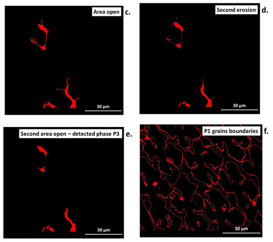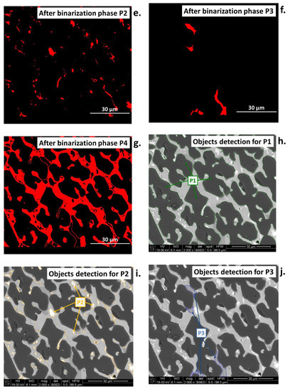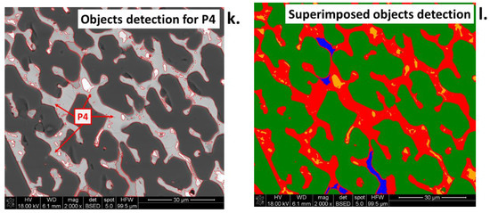 Figure 15a–j show the output images from the following steps of the image analysis. In the first stage, the input image (Figure 15a) is marked with the region of interest (ROI. Figure 15b) to remove the black bar along the bottom that contains metadata of the SEM analysis. Only the ROI is taken for the image analysis, which is then subjected to median filtering to remove minimal noise (Figure 15c). Subsequently, the binary images obtained by thresholding are generated for every individual object of interest, namely phases marked as P1, P2, and P3 (threshold selected using a profile; Figure 15d–f). The fourth object—P4—is determined by first detecting the ROI analyzed area and subsequently applying a log difference between ROI and the previously detected objects P1, P2, and P3 (Figure 15g). Additionally, the alternating operations of erosion, areaopen (a built-in function in Aphelion), erosion, and areaopen were applied, which allowed the removal of the lines of P1 phase grain boundaries (treated the same as P3) and final detection of the P3 phase. The next step was the presentation of every detected phase in a separate image (Figure 15h–k). Finally, all the detected phases were superimposed on the same image, marked in different colors for better and complete visualization of the results (Figure 15l).