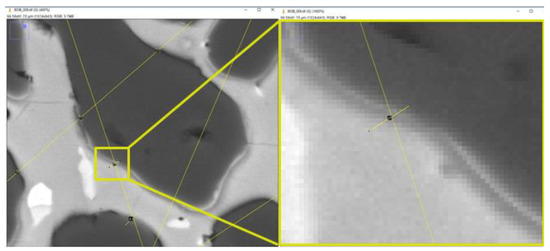 Most SEM microscopes detect two types of electrons, namely back-scattered electrons (BSE) and secondary electrons (SE). The former are produced due to elastic scattering of beam electrons from the atomic nucleus of the sample and are derived from the deeper parts of materials (100–1000 Å); the latter come from the sample and are produced as a result of bombarding of the surface atoms (10–300 Å) by beam electrons [21,31]. The detectors used for BE (passive detectors, scintillation detectors, semiconductor BSE detector) and SE (Everhart–Thornley detector, through-the-kens electron detectors) were described in [21]. Detection of the BSE signal produces images, in which contrast depends on relative differences in atomic numbers, in contrast to secondary electrons detection mode, which provides information only about the topography of the specimen. In general, the brighter the microarea, the higher its atomic mass. In contrast, the darker microareas indicate lower atomic mass, or resin-filled porosity. Thanks to these signals, the determination of phase composition can be postulated.