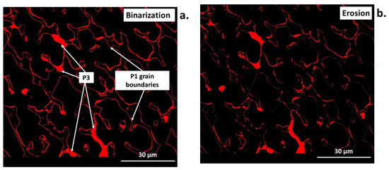 Figure 20. SEM image during automated analysis for P3 phase: (a) after thresholding, (b) after thresholding followed by morphological transformations (cf).