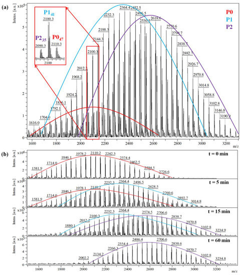 MALDI MS spectrum of the quenched reaction mixture obtained in reaction #2 at (a) 15 min, and (b) at different reaction times, highlighting the three existing populations in the system (unreacted PEG—P0, mono-, and di-functional PEG—P1, respectively P2).