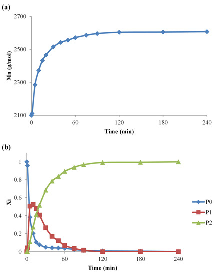The Mn evolution for the #2 reaction—(a) overall Mn values plot and (b) separate plot of P0, P1, and P2 species.