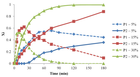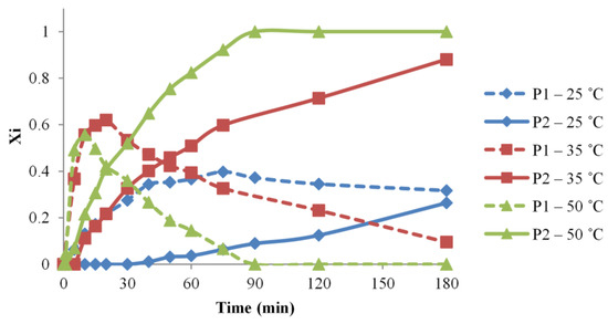 Thus, in the current study, the temperatures of 25, 35, and 50 °C, respectively, were considered, aiming to describe the reaction system, qualitatively and quantitatively. In Figure 4, the evolution of the relative content in P1 and P2 species is represented according to the reaction temperature. The formation of P1 species for the 35 and 50 °C reactions undergoes almost as fast, but because of a better consumption of P1 and transformation into P2 for the highest tested temperature, P1 species reach a higher relative content in the reaction carried at 35 °C. However, the reaction performed at 25 °C leads to a low relative amount of P1 species.