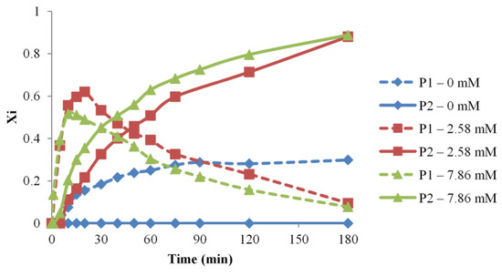 P1 and P2 relative molar fractions evolution for various concentration conditions (#1, 2, 3).