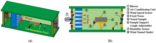 Unfortunately, the carbonation mechanism under a windy environment is very complex. Aside from the wind pressure which promotes the invasion of CO2, the evolved inner humidity under variant windy environments also influences the carbonation process. For that reason, the carbonation test performed under a windy environment remains limited at the current stage. Li et al. [12] simulated an aeolian washout environment using high-speed wind carrying sands, and a carbonation test was conducted under that simulated condition. The experimental result verified that both the lash by the washout and the deformation by carbonation deteriorated the microstructure of concrete structures. Even though the work is innovative, the aeolian washout was not a common windy environment, so the revealed mechanism was more applicable for harsh natural environments. Therefore, in order to reveal the carbonation mechanism in-site, carbonation under a milder windy environment should be carried out next.