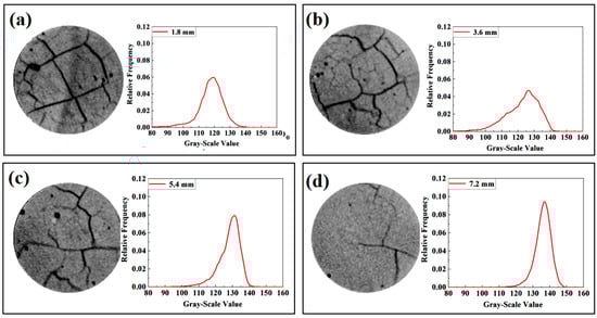 Figure 2 shows the typical digital images rendered from the cross sections of SL75. The wind speed was 2.5 m/s, and the CT scan was performed at 28 d of carbonation. From Figure 2a–d, the images were related to the cross section 1.8 mm, 3.6 mm, 5.4 mm, and 7.2 mm, respectively, beneath the carbonation face. As shown, honeycomb-shaped crack networks pervaded the cross section of the carbonated areas, but the network gradually vanished at deeper (non-carbonated) areas. The generation of cracks in the carbonated area is within our expectation since the hydration product changed from C-S-H in ordinary Portland cement (OPC) to C-(A)-S-H/ N-S-H in AAM. The autogenous shrinkage, drying shrinkage, and the carbonation shrinkage in SL75 were all orders of magnitude larger than that of OPC [21,22,23], and that leaded to severe cracking. Moreover, the cracks generated could serve as a “detour” to benefit the invasion of CO2, which also promoted the carbonation. Therefore, it is essential to enhance the cracking resistance of AAM, especially under windy environments.