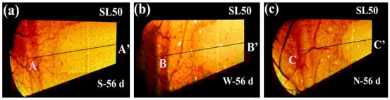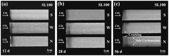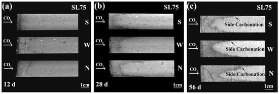 Rendered axial planes of SL75 at (a) 12 d, (b) 28 d, and (c) 56 d of carbonation. “S”, “W”, and “N” stand for steady, weak windy, and normal windy environments.