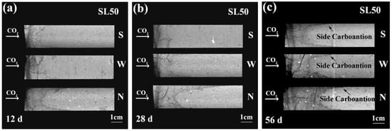 Rendered axial planes of SL50 at (a) 12 d, (b) 28 d and (c) 56 d of carbonation. “S”, “W”, and “N” stand for steady, weak windy, and normal windy environments.