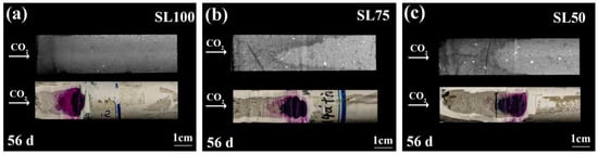 To validate the reliability of the carbonated areas revealed by CT, phenolphthalein spray was applied. The inner areas of SL100, SL75, and SL50 (subjected to a 5.5 m/s windy environment) were exposed by a diamond saw, and the axial planes after phenolphthalein spray are shown, respectively, in Figure 6. Note that the carbonated AAM was very fragile, thus all of the cutting process was conducted very carefully. As shown, the carbonated zone read from phenolphthalein agrees with the read from CT, verifying that the gray-scale value can be used to trace the carbonation in AAM. Better yet, it was noticed that the carbonation front could be clearly revealed by CT, while for specimens sprayed with phenolphthalein, the carbonation front was somehow vaguer.