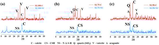 XRD diffractograms of non-carbonated and carbonated: (a) SL100, (b) SL75 and, (c) SL50 specimens. C: carbonated; NC: non-carbonated.
