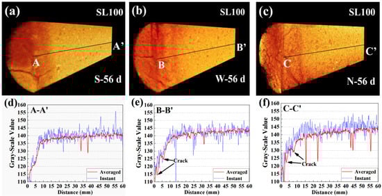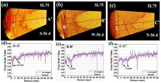 In order to reveal the cracking, the distribution of gray-scale value was revisited. Even though the tiny cracks were invisible due to CT’s limited resolution, the fluctuation of the local gray-scale value still “hinted” at the existence of cracking. Take SL50 at 56 d of carbonation as an example (see Figure 13, exposed, respectively, to 2.5 m/s and 5.5 m/s windy environments): even though the crack morphology was invisible, the anomalous low gray-scale value caused by both cracking and subsequent carbonation still indirectly pointed out the existence of cracking.