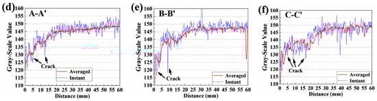 Figure 8d–f show the 1D distributions of gray-scale value along the carbonation depth. To ravel out the disturbance of the irregular-shaped carbonation front, both instant and averaged (averaged from 80 instant profiles) 1D gray-scale value profiles are presented. The gray-scale value of the non-carbonated area was in the range of 135 to 145, but that decreased drastically after carbonation. Based on the reduced gray-scale value, the carbonation depths of SL100 at 56 d of carbonation were estimated to be approximately 110 mm, 120 mm, and 150 mm, respectively, when exposed to 0 m/s, 2.5 m/s, and 5.5 m/s windy environments. The result highlighted the carbonation promoted by the wind. These things considered, judging from the averaged 1D profiles, the carbonation depths under all windy environments were quite similar. Even so, undulation was revealed around the carbonated part in the 2.5 m/s and 5.5 m/s profiles, which suggested ongoing of cracking. The whole carbonation process can be regarded as diffusion-controlling if a narrow carbonation front is revealed, while a broader carbonation front suggests that the investigated carbonation is not solely controlled by diffusion [9,41,42,43]. Detailed to the present study, unlike the observation earlier, the carbonation front at 56 d of carbonation was broader based on an instant 1D profile (especially for 5.5 m/s windy environment). The result suggested that the carbonation of SL100 could no longer be regarded as a diffusion-controlling progress, especially facing high windy environments.