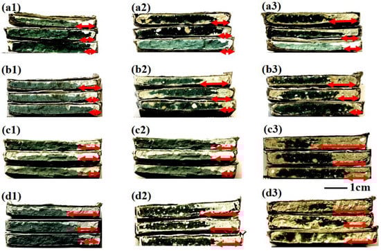 Typical cross sections of partly carbonated slices: (a–c), and (d) stand for 12 d, 28 d, 56 d and 112 d of carbonation, respectively; suffix “1”, “2”, and “3” stand for SL100, SL75, and SL50 respectively; from top to bottom, the slices were related to AAM preconditioned at 30%, 50%, and 70% RH.