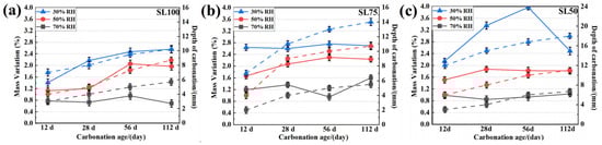 Mass Variation (solid lines)/carbonation depth (dashed lines) vs. carbonation age for (a) SL100, (b) SL75 and (c) SL50.