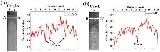 Identification of cracking through linear distribution of gray-scale value: (a,b) stand for SL50 carbonated under 0 m/s and 5.5 m/s windy environments, separately.