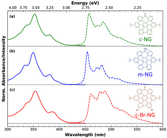 Figure 1 permits appreciating the well-defined fine structure characterizing both the steady-state absorption (continuous lines) and the emission (dashed lines) spectra of dichloromethane solutions of the three nanographenes (in 10−6 M concentration). UV-Vis spectra reveal essentially the same structured profile, with three main subpeaks at 355, 338 and 380 nm, which, according to Clar’s rule for PAHs [39], can be associated to , and p-bands. The very weak absorption edge between 430 and 460 nm, better discernable in more concentrated solutions (10−5 M) (see Figure S1), is assigned to -bands. Its low oscillator strength accounts for the forbidden nature of such a lowest energy transition. Since the main absorption profile is substantially the same in all three nanographenes, we can infer that the different edge functionalization has a negligible impact on the main absorption transitions.