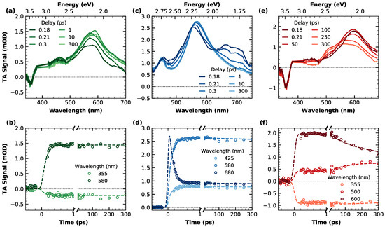 Top panels: transient absorption spectra of (a) c-NG, (c) m-NG and (e) c-Br-NG, acquired at different time delays from photoexcitation ( nm). Data around 400 nm were removed because of pump scattering. Bottom panels: transient absorption kinetic traces and relative fitting curves cut at different probe wavelengths of (b) c-NG, (d) m-NG and (f) c-Br-NG.