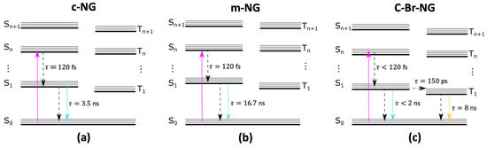 Illustration of the excited-state electronic deactivation pathways and associated timescales of (a) c-NG, (b) m-NG and (c) c-Br-NG.