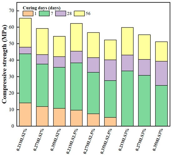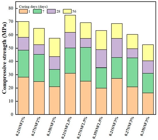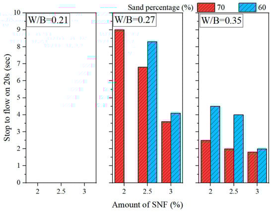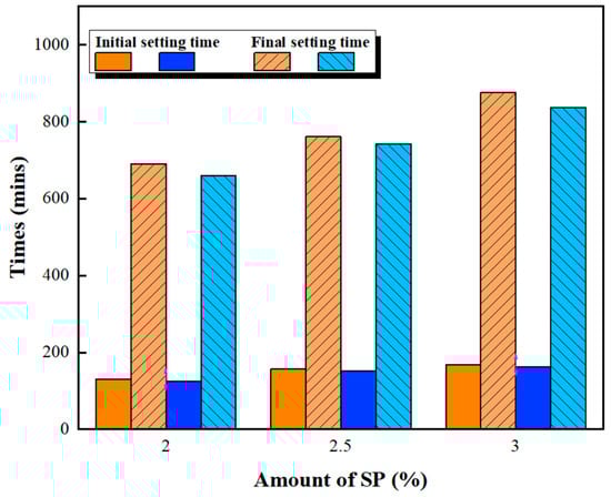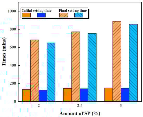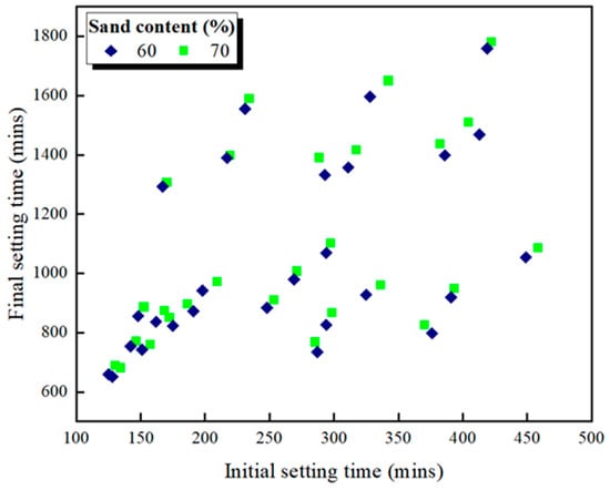 Figure 1 and Figure 2 show the slump fluidity experiments for PCE and SNF; because the slurry of MLS itself was less fluid, the experiment could not be carried out. The experimental results show that, in the case of low W/B, the addition of 2% could not produce fluidity; therefore, these data are not displayed. With W/B = 0.35, the sand content had little effect on fluidity, and the best fluidity was achieved with W/B = 0.27 and the addition of 3%. Figure 3, Figure 4 and Figure 5 depict the results regarding the setting time. Both levels of sand content (i.e., 60% and 70%) exhibited consistent setting-time trends (i.e., the setting time increased with the W/B ratio). The longest setting time was recorded with 3 wt.% SNF when the sand content was 70%; the initial setting time was 458 min, and the final setting time was 1793 min. These results agree with those of Niu et al. [55], who reported that sulfonated naphthalene SPs increased the setting time of cement materials. When the initial and final setting times were similar, the development of concrete strength was affected. For instance, an increase in the W/B ratio from 0.27 to 0.35 increased the initial setting time by 23.4% to 48.5% and the final setting time by 4.9% to 13.6%. Similarly, an increase in the W/B ratio from 0.21 to 0.35 increased the initial setting time by 81.3% to 184.6% and the final setting time by 5.7% to 35.8%. Therefore, both the initial and final setting times were obtained. To determine the effects of the amount of SP added on workability, the ratio of the final to initial setting times (F/I) was calculated. The highest F/I value was 7.7, which was achieved when 2 wt.% MLS was added, because of the high viscosity of MLS [56]. Because SPs were adsorbed on the surfaces of the cement particles and because an increase in the amount of SP added caused an increase in their absorption, the formation of chains between hydration products was delayed, resulting in retarded setting and poor workability. Hence, the flow comparison results were obtained. Figure 6 depicts the setting times achieved when sand content levels of 60% and 70% were used. Regardless of the various effects of SPs on the setting time, the sand content exhibited a minimal effect on the setting time of the GEGM, suggesting that the sand content only affected the flow of the GEGM and not the setting time. This was due to the high level of fine aggregate content, which retained water and thus resulted in retarded setting during the final setting process.