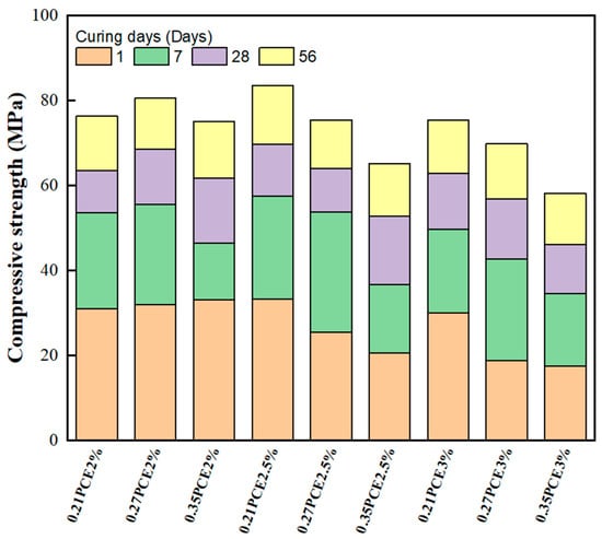 Compressive strength is one of the most crucial properties of the GEGM. Figure 7, Figure 8 and Figure 9 depict the results of compressive strength experiments conducted with the three aforementioned SPs. The optimal compressive strength (83.62 MPa) was achieved when the W/B ratio was 0.21, when the sand content was 70%, and when 2% PCE was added. When the W/B ratio increased, the compressive strength decreased. For instance, for PCE, when the W/B ratio increased from 0.27 to 0.35, the compressive strength decreased by approximately 11.7% to 16.6%. For SNF, when the W/B ratio increased from 0.27 to 0.35, its compressive strength decreased by approximately 8.6% to 12.8%. Finally, for MLS, when the W/B ratio increased from 0.21 to 0.27 and from 0.21 to 0.35, its compressive strength decreased by approximately 7.5% to 9%. Hence, the three SPs yielded consistent results, because the addition of the SP agents enhanced the workability of the GEGM and made the slurry sticky. However, the addition of these agents reduced the compressive strength [57,58,59]. The main reason for this is that the addition of too much of these agents causes molecules to adsorb on the surface of the particles, which will hinder the surface tension of the cement mortar and cause many small air bubbles to form, resulting in a decrease in the compressive strength. For PCE and SNF, when curing was performed for 1–7 days, the compressive strength increased considerably. However, when curing was performed for more than 28 days, the compressive strength decreased. For MLS, a different outcome was observed; that is, when the MLS content was increased to 3%, the setting was retarded, which made the compressive strength unobservable on the first day of curing. Because all three SP agents used in this study exhibited consistent developmental trends, a regression analysis of their compressive strengths and water absorption rates was performed. As shown in Figure 10, a linear regression equation was used. The results revealed that y = 9.59 − 0.098x and R2 = 0.78, indicating the reliability of the results. According to Figure 10, when the compressive strength increased, the water absorption rate decreased. As shown in Figure 11, to identify the regression relationship between the ultrasonic wave speed and compressive strength, the ultrasonic wave speed was measured using a nondestructive testing method. Additionally, the prediction of compressive strength through ultrasonic wave speeds revealed an R2 of 0.88, indicating high reliability. When curing was performed for 28 to 56 days, the sand content of 70% yielded the highest compressive strength. At said content, the longer the curing duration was, the greater the difference in compressive strength was. This is because concrete with 70% sand content had low porosity, resulting in a more compact specimen and higher compressive strength.
