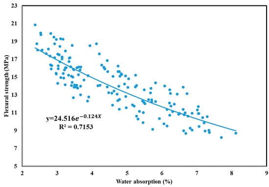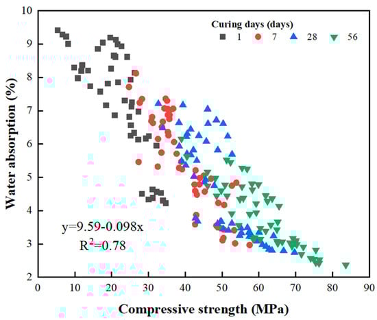 - Compressive strength and the water absorption rate were used to build a regression model. The results indicated that y = 9.59 − 0.098x and R2 = 0.78, verifying the reliability of the results.