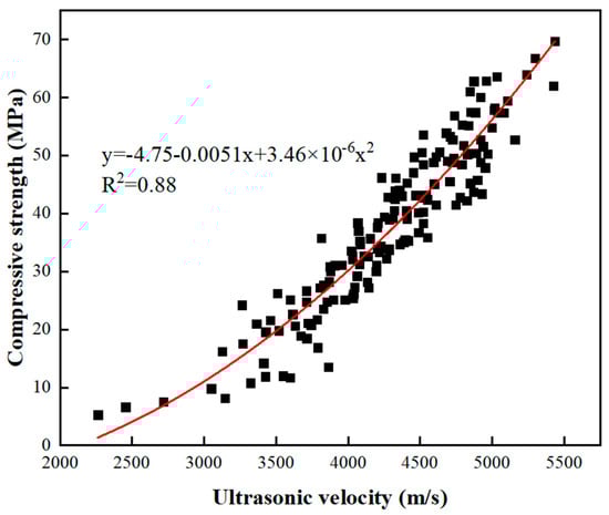 - Compressive strength and the ultrasonic wave speed were used to build a regression model. The results indicated that y = −4.75 − 0.0051x + 3.46 × 10−6x2 and R2 = 0.88, verifying the reliability of the results.