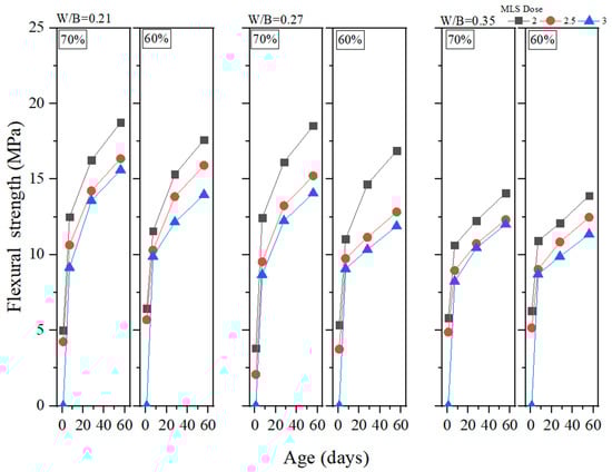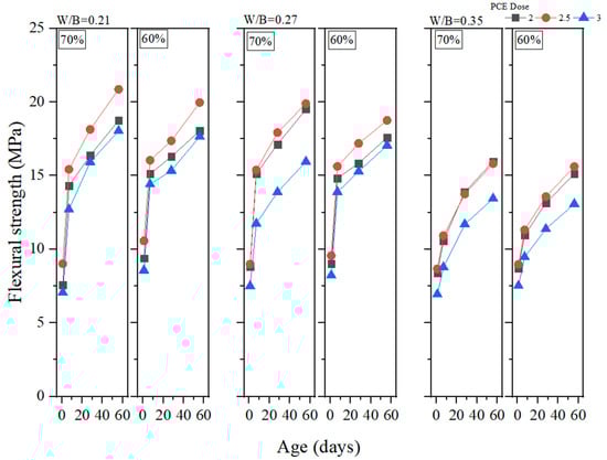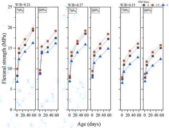 Flexural strength is a crucial property of GEGMs which should be examined if they are to be used in offshore wind turbines. This is because the materials used in a wind turbine must be able to effectively withstand the effects of external forces at sea. In this study, flexural strength experiments were conducted on PCE, SNF, and ML, and the results are presented in Figure 12, Figure 13 and Figure 14, respectively. As shown in Figure 10, the addition of 2.5% PCE yielded optimal results, especially at low W/B ratios. When curing was performed for 56 days, the flexural strength reached 20.86 MPa, the highest value reached among all experiments. As shown in Figure 13, the addition of 2.5% SNL yielded optimal results, with an increase in the W/B ratio decreasing the flexural strength. As shown in Figure 14, the addition of 2% ML yielded optimal results. The figure also depicts the effects of the sand content and how these effects became more pronounced at low W/B ratios. When the W/B ratio increased to 0.35%, the sand content had a minor effect on flexural strength. When curing was performed for 1–7 days, 60% sand content produced a compressive strength that was 4% to 24.1% higher than that produced with 70% sand content. When curing was performed for 28–56 days, 60% sand content produced a compressive strength that was 0.5% to 4.3% lower than that produced with 70% sand content. Therefore, in this study, regression analyses of flexural strengths and water absorption rates were performed, and the results are depicted in Figure 15. Here, a correlation (R2) of 0.71 was observed. Although this value is less than 0.8, it still reached a favorable level of reliability.