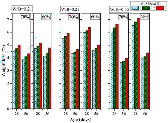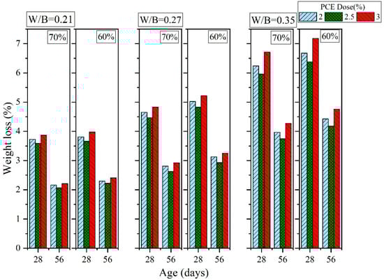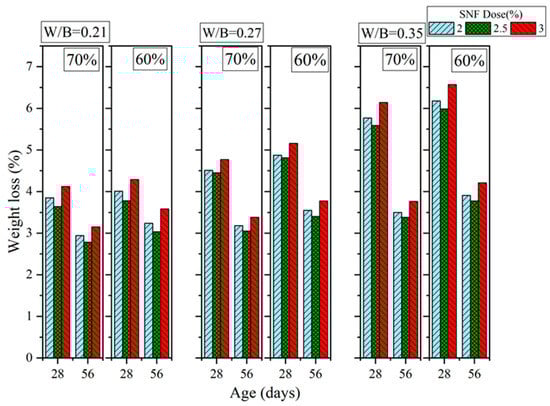Figure 16, Figure 17 and Figure 18 show the results of the sulfate resistance experiments. Specimens with 70% sand content exhibited greater sulfate resistance than those with 60% sand content. This is because the specimens with 70% sand content were denser and thus more resistant to sulfates; these specimens also exhibited decreased weight loss rates. For PCE, the weight loss rate was 3.59% to 3.87% when the W/B ratio was 0.21, when 2% to 3% PCE was added, when curing was performed for 28 days, and when the sand content was 70%. However, when the sand content was 60% (while keeping the other variables constant), the weight loss rate reached 3.66% to 3.98% (an increase of 1.95% to 2.84%). When the curing duration was increased to 56 days, the 70% and 60% sand contents resulted in weight loss rates of 2.07% to 2.21% and 2.22% to 2.41%, respectively (the latter was 6.48% to 9.04% higher than the former). Moreover, the addition of 2.5% PCE and SNF resulted in the lowest weight loss rates. These results are consistent with those obtained regarding mechanical properties because the additives made the GEGM specimens denser and thus more resistant to sulfates. In terms of MLS, the optimal sulfate resistance was achieved when 2% MLS was added. Because MLS induced retarded setting in the GEGM, and therefore retarded hydration, only a small amount of MLS should be added to avoid compromising the engineering properties and effectiveness of the GEGM.