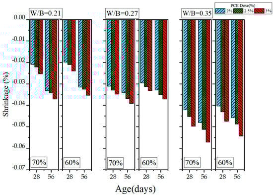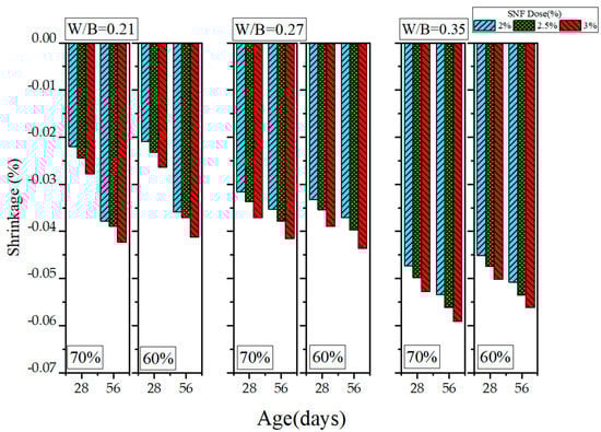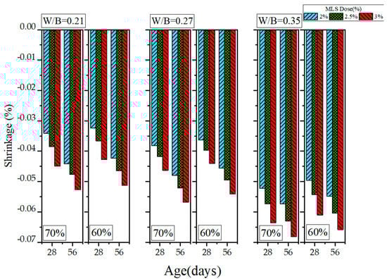 Because HPC has a low W/B ratio, it exhibits drying shrinkage, a problem that many scholars have attempted to solve. In this study, length change experiments were conducted to examine the drying shrinkage of the GEGM. The results are presented in Figure 19, Figure 20 and Figure 21. As shown in Figure 19, when the W/B ratio was 0.21 and when 2% to 3% PCE was added, the length change was within the range of −0.0331% to −0.0371%. When the W/B ratio was increased from 0.21 to 0.27, the length change reached −0.034% to −0.0391%, an increase of approximately 2.71% to 7.9%. When the W/B ratio was further increased from 0.27 to 0.35, the length change reached −0.0481% to −0.0571%, an increase of approximately 29.8% to 49.8%. When the W/B ratio was low, the changes in drying shrinkage were small, presumably because the water used was able to completely hydrate the materials. Therefore, once the curing duration reached 56 days, the drying shrinkage was minimal. Regarding the sand content, MLS analysis revealed that adding 2% to 3% MLS, curing it for 28 days, and selecting s sand content of 70% all contributed to a length change of −0.0341% to −0.0449%. However, selecting a sand content of 60% (while holding the other variables constant) contributed to a length change of −0.0324% to −0.0427%, a decrease of 4.89% to 4.98%. Once the curing duration reached 56 days, selecting a sand content of 70% contributed to a length change of −0.0442% to −0.0489%. However, selecting a sand content of 60% (while keeping the other variables constant) contributed to a length change of −0.0423% to −0.0465%, a decrease of 4.29% to 4.9%. The drying shrinkage with 60% sand content was approximately 4.29% to 4.9% lower than that with 70% sand content, because the higher sand content increased the overall compactness of particle distribution and increased the slurry’s contraction.