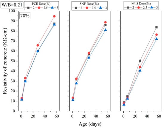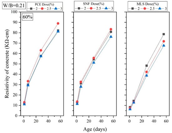 Four-terminal resistance measurement is a nondestructive test which uses resistivity to determine the number of pores in specimens and subsequently determine their durability. This test is based on the fact that a higher electrical resistance indicates a higher density, and density and durability are correlated. Experiments were conducted in this study to obtain the electrical resistance of GEGM specimens and assess the correlation between electrical resistance and water absorption rate. As shown in Figure 22 and Figure 23, the longer the curing duration, the greater the electrical resistance and the lower the water absorption rate. This means that the higher the electrical resistance, the greater the density. When curing was performed for 1–7 days, no correlation was observed between the sand content and electrical resistance. However, once the curing duration reached 28–56 days, the specimens became denser, and the electrical resistance, as a result of the sand content and porosity being different, increased. Sand content of 70% resulted in the highest density, thereby optimizing the packing performance. When the W/B ratio was 0.21, when 2% to 3% PCE was added, when curing was performed for 1 day, and when the sand content was 70%, the electrical resistance was 11.33 to 13 kΩ·cm. When the sand content was decreased from 70% to 60% (while keeping the other variables constant), the electrical resistance reached approximately 11 to 12.33 kΩ·cm, a minimal change. When curing was performed for 7 days, sand content of 70% resulted in an electrical resistance of approximately 29.67 to 33 kΩ·cm. When the sand content was decreased from 70% to 60%, the electrical resistance reached approximately 29.33 to 33.33 kΩ·cm, a minimal change. When curing was performed for 28 days, a sand content of 70% resulted in an electrical resistance of 59.67 to 65.66 kΩ·cm. When the sand content was decreased from 70% to 60%, the electrical resistance reached approximately 57.33 to 63.67 kΩ·cm, a decrease of 3% to 4%. When curing was performed for 56 days, a sand content of 70% resulted in an electrical resistance of 86.33 to 94.67 kΩ·cm. When the sand content was decreased from 70% to 60%, the electrical resistance reached 80.67 to 88.67 kΩ·cm, a decrease of 6.33% to 6.56%.