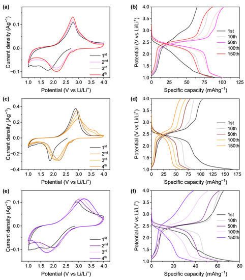 Cyclic voltammetry (CV) curves of (a) PDI_A, (c) PDI_V, and (e) PDI_H at 10 mVs−1 in a potential range of 1.0 V–4.0 V vs. Li/Li+. Galvanostatic charge–discharge profiles of (b) PDI_A, (d) PDI_V, and (f) PDI_H at 50 mAg−1.
