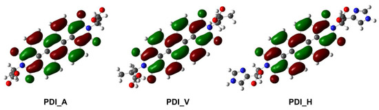 Geometrical optimizations for isolated molecules of PDI_A, PDI_V, and PDI_H in the vacuum state were performed at the B3LYP/6-31+G(d,p) level using the Gaussian 16W software package [26].