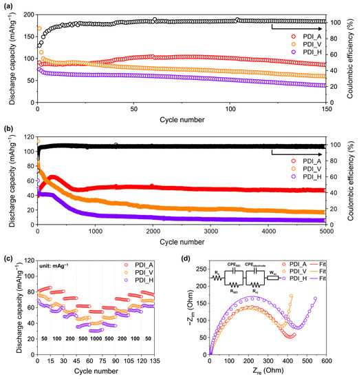 Figure 3c depicts the rate capabilities of PDI_AAs cathodes in each 15 charge–discharge cycle by increasing the discharge current density from 50 mAg−1 to 1000 mAg−1 and then reversing the decrease back to 50 mAg−1. Each average discharge capacity at various current densities (50, 100, 200, 500, 1000, 500, 200, 100, and 50 mAg−1) was (PDI_A: 83, 80, 72, 62, 55, 60, 70, 75, and 78 mAhg−1), (PDI_V: 73, 63, 55, 46, 40, 47, 55, 62, and 69 mAhg−1) and (PDI_H: 63, 57, 50, 37, 30, 38, 51, 56, and 62 mAhg−1). Notably, the recovery of the PDI_AAs cathodes was (PDI_A: 94%), (PDI_V: 95%), and (PDI_H: 98%), which showed their excellent rate capability above 90%.