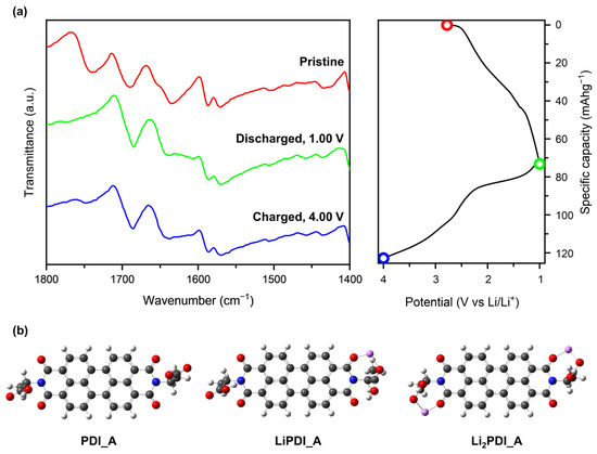 (a) ATR FT-IR spectra of PDI_A cathode at different charged states on the specific point of first galvanostatic charge–discharge profile; (b) optimized structure of PDI_A, LiPDI_A, and Li2PDI_A based on DFT calculations.